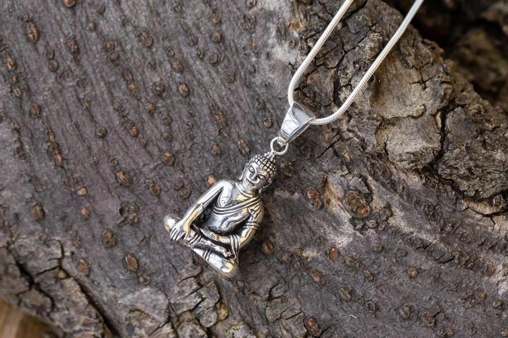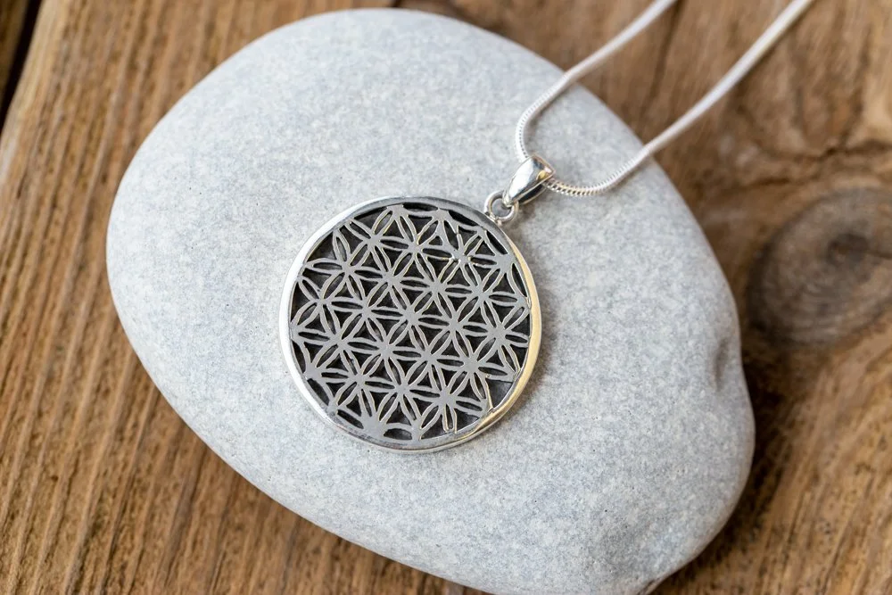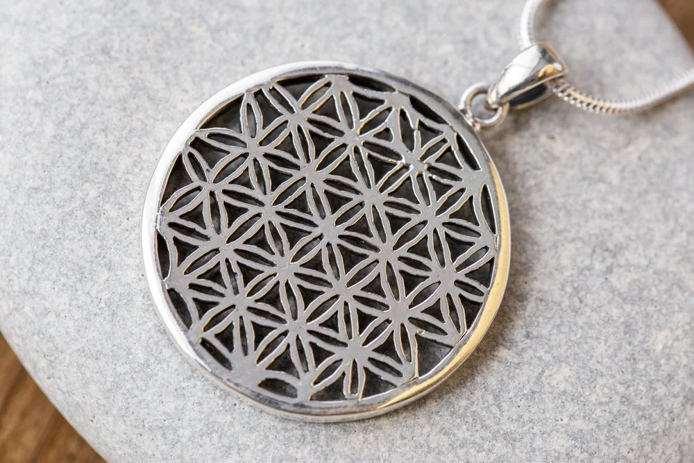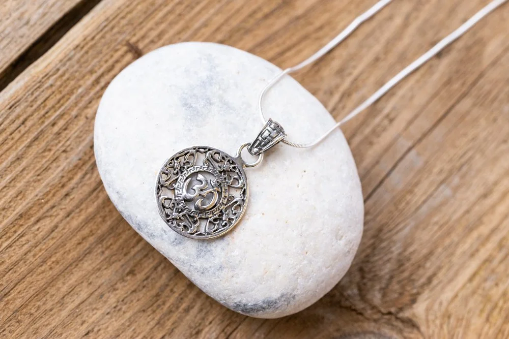 Silver “Om or Aum” Necklace. Om is the primordial sound from which the universe was created. It is also the seed sound for the crown chakra. AUM is also the prime symbol in Hinduism as it represents the trinity of the Brahma (the creator) Vishnu (the preserver) and Vishnu (the destroyer).